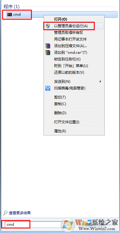 1、點(diǎn)擊“開(kāi)始”,在搜索框中輸入:cmd,。右鍵點(diǎn)擊“cmd”,選擇“以管理員身份運(yùn)行”。