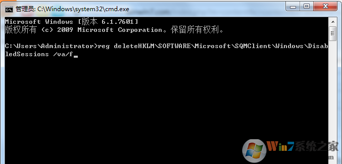 2、輸出以下內(nèi)容并回車(chē):reg deleteHKLM\SOFTWARE\Microsoft\SQMClient\Windows\DisabledSessions /va/f,點(diǎn)擊確定等待處理完成,這里因?yàn)樽址容^長(zhǎng),所以建議在cmd中使用右鍵黏貼功能