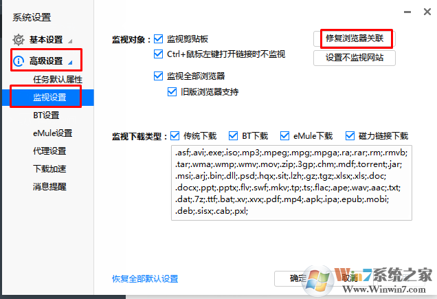 打開迅雷之后找到設(shè)置,選擇高級設(shè)置--瀏覽器關(guān)聯(lián)---修復(fù)瀏覽器關(guān)聯(lián)