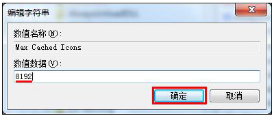 4、將“編輯字符串”窗口里的數(shù)值數(shù)據(jù)設置為“8192”,然后點擊“確定”按鈕保存修改,如下圖所示: