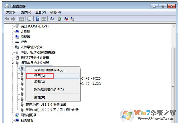 2、在設(shè)備管理器中,展開“通用串行總線控制器”,在“USB2 Enhanced”項(xiàng)上單擊右鍵,點(diǎn)擊“停用”,停用之后一般可以正常識別“unknown device”驅(qū)動。