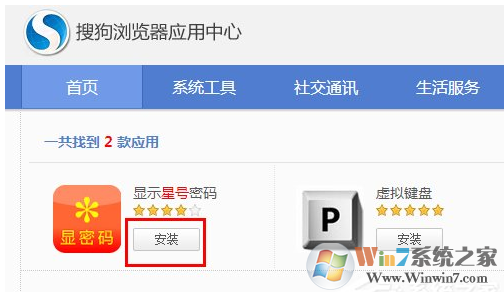 3、接著在打開的“應(yīng)用中心”界面中,搜索“顯示星號密碼”并點(diǎn)擊“安裝”按鈕。