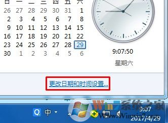 4、接下來點(diǎn)擊任務(wù)欄中的“時(shí)間”圖標(biāo),從打開的界面中點(diǎn)擊“更改日期和時(shí)間設(shè)置”按鈕。
