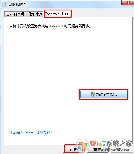 5、在打開的窗口中,切換至“Internet時(shí)間”選項(xiàng)卡,點(diǎn)擊“更改設(shè)置”按鈕。