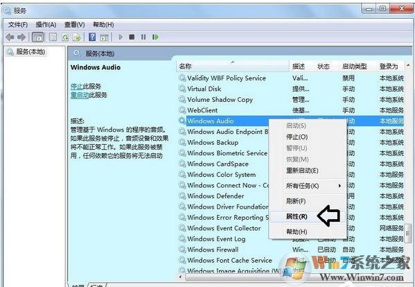 3、依次找到Windows Audio服務(wù)→啟動(dòng)。如果還是出錯(cuò)→雙擊打開(kāi)(或點(diǎn)擊屬性)。