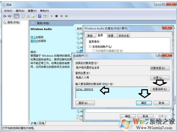 5、然后輸入:lo再點(diǎn)擊檢查名稱(chēng)按鈕,之后會(huì)搜索出來(lái)Local Service→確定→確定。然后,再去開(kāi)啟Windows Audio聲音服務(wù)即可。