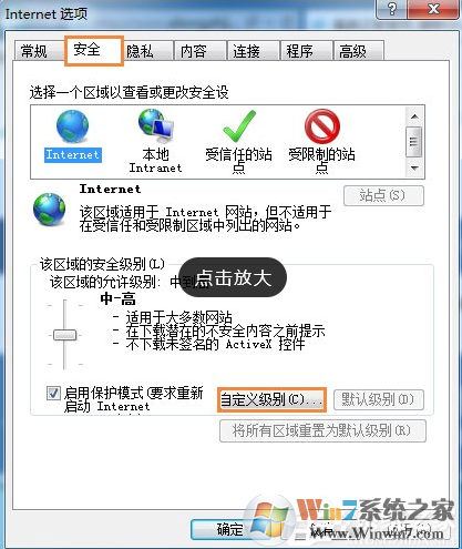 3、切換到“安全”標(biāo)簽,點擊“自定義級別”。