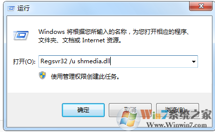 打開“開始菜單”,點(diǎn)擊“運(yùn)行”命令后輸入“Regsvr32 /u shmedia.dll”回車即可。