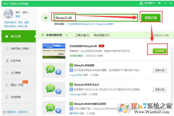 4、打開之后在輸入框中直接輸入“libeay32.dll”,然后點(diǎn)擊“查找方案”,在查找到的結(jié)果當(dāng)中,有一個(gè)“無法找到組件libeay32.dll”后面還跟得有“立即修復(fù)”字樣,就是它了,點(diǎn)擊“立即修復(fù)”。