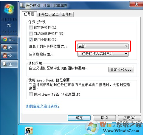 2、打開任務(wù)欄和開始菜單屬性后,找到屏幕上的任務(wù)欄位置,點(diǎn)擊下拉箭頭,選擇底部,然后選擇應(yīng)用---確定,即把任務(wù)欄還原到桌面的下方了。