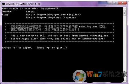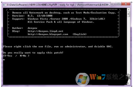 5、重啟電腦,在開機(jī)的時(shí)候選擇Windows 7 x86 [ 128GB with ntkr128g.exe ]即可進(jìn)入系統(tǒng),但此時(shí)會發(fā)現(xiàn)屏幕右下角提示處于測試版,現(xiàn)在我們打開RemoveWatermark去水印補(bǔ)丁文件夾,根據(jù)系統(tǒng)選擇文件(我想用ReadyFor4GB的都是x86)根據(jù)提示輸入“Y”。