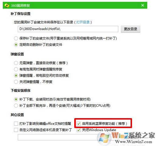 5、然后找到啟用系統(tǒng)藍(lán)屏修復(fù)功能,勾選或空白。這樣就能啟用和關(guān)閉360藍(lán)屏修復(fù)功能。