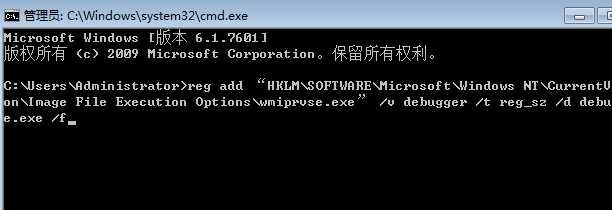 2、在命令提示符中輸入:reg add “HKLM\SOFTWARE\Microsoft\Windows NT\CurrentVersion\Image File Execution Options\wmiprvse.exe” /v debugger /t reg_sz /d debugfile.exe /f 按下回車鍵即可。