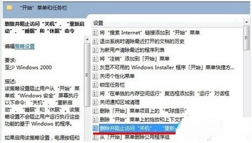 5、在本地組策略設(shè)置窗口中,找到”用戶配置——管理模板——“開(kāi)始”菜單和任務(wù)欄,然后在右側(cè)窗口中找到并雙擊:刪除并阻止“關(guān)機(jī)”、“重新啟動(dòng)”、“睡眠”和“休眠”命令在“開(kāi)始”菜單可用。在彈出的設(shè)置窗口中,設(shè)置為“已禁用。
