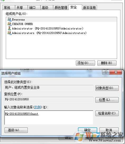 查看一下連接打印機的電腦的打印機設(shè)置里面,在安全選項卡下,把GUEST 添加到可訪問列表里面Winwin7.com