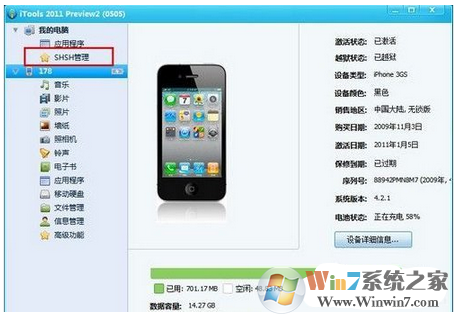 2、在iTools主界面會顯示當(dāng)前連接設(shè)備的信息。選擇SHSH管理選項。
