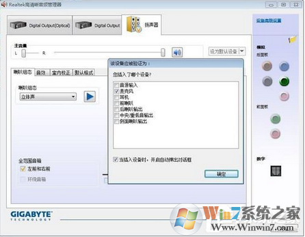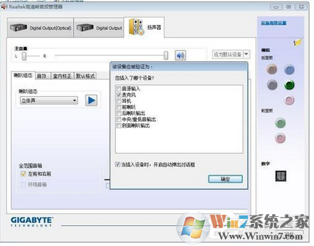 3、在上一步彈出的“目前連接的設(shè)備應(yīng)辨識(shí)為”對(duì)話框,根據(jù)你插入的設(shè)備來(lái)選擇就行,這里我們是插入音箱嘛,所以勾選音源輸入即可,最后點(diǎn)擊確定