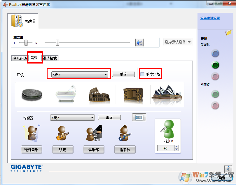 6、我們可以在此軟件上設(shè)置相應(yīng)的音效,讓音效達(dá)到自己最舒服的效果,選擇一下環(huán)境、然后將均衡度打鉤