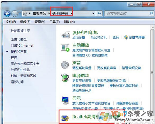 1、先把你的音箱音頻線拔下來(lái),暫時(shí)不連接上,在控制面板中打開硬件和聲音按鈕,出現(xiàn)的界面如下圖所示,點(diǎn)擊其中的音頻管理器:
