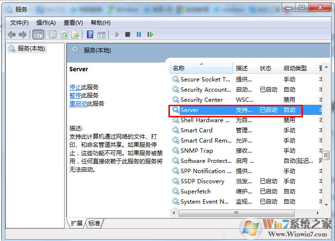 2、彈出“服務(wù)”對(duì)話框,在右邊窗格中,找到server,雙擊。