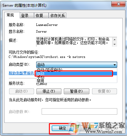 3、彈出“server的屬性”對(duì)話框,將中間的“啟動(dòng)類(lèi)型”改為:自動(dòng)。“服務(wù)狀態(tài)”設(shè)為:?jiǎn)?dòng)。