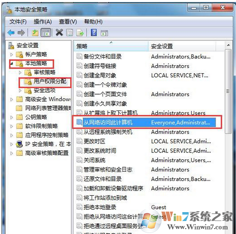 5、彈出“本地安全策略”對(duì)話框。選中左窗格中的“本地策略”——“用戶權(quán)限分配”。在右窗格中,選中“從網(wǎng)絡(luò)訪問(wèn)此計(jì)算機(jī)”選項(xiàng)。