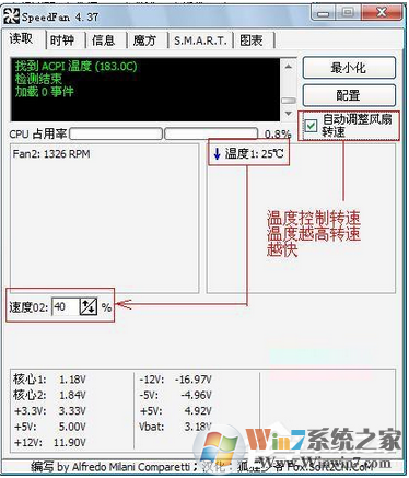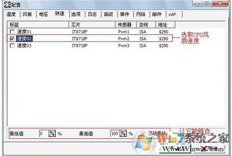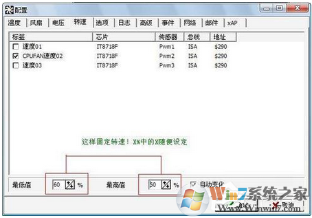 6、圖中最下方的設(shè)定是SpeedFan的自動調(diào)整轉(zhuǎn)速功能,我們啟用自動變化。