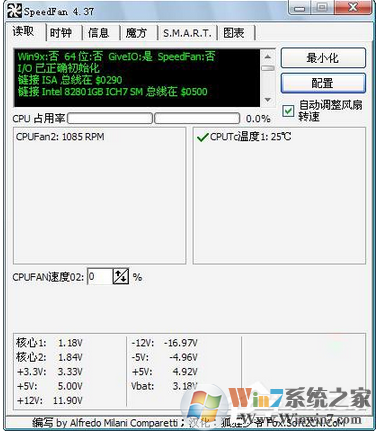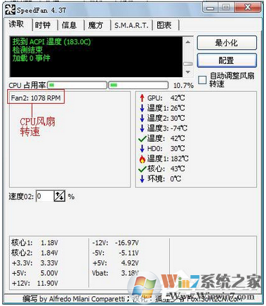 10、最后,將「自動調(diào)整風(fēng)扇轉(zhuǎn)速」打勾。不過需要注意,主板的控制芯片必須被SpeedFan所支持,風(fēng)扇所在插座必須有調(diào)速功能,SpeedFan自動調(diào)速才能生效。如果我們讓SpeedFan開機自動調(diào)速,那么將SpeedFan的快捷方式放入“啟動”文件夾,這樣軟件自然會在開機時自動啟動,然后根據(jù)CPU溫度自動調(diào)速。另外配置的時候,按F2鍵可以更改“速度02”顯示為“CPUFAN速度02”,如圖所示。