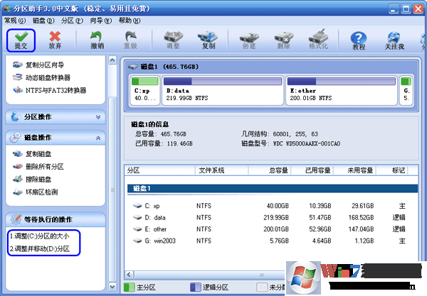6、最后不要忘記點擊工具欄上的“提交”按鈕來執(zhí)行真實的操作,另外您可以在主界面上看到等待執(zhí)行的操作中有兩個操作(藍(lán)色框圈住的地方),如下圖6,即把這個操作保存到磁盤上。執(zhí)行過程中可能需要花一會時間,所花時間的長短由分區(qū)中的數(shù)據(jù)的多小而定。這需要您耐心地等待,絕對不要強行關(guān)閉分區(qū)助手。