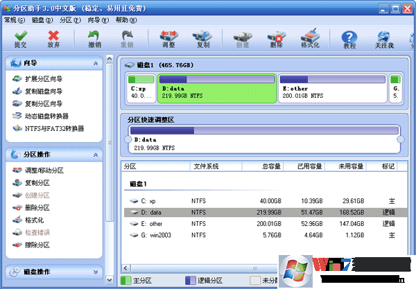2、這步的目標(biāo)是縮小C盤,請選中C盤并移動鼠標(biāo)到“分區(qū)快速調(diào)整區(qū)”的最右端,然后當(dāng)鼠標(biāo)指針變成雙向箭頭時,點擊圓形的手柄并向左拖動鼠標(biāo)來縮小這個分區(qū)到40GB,如下圖2所示:(您也可以右擊C盤選擇“調(diào)整/移動分區(qū)”選項來縮小C分區(qū)) winwin7.com
