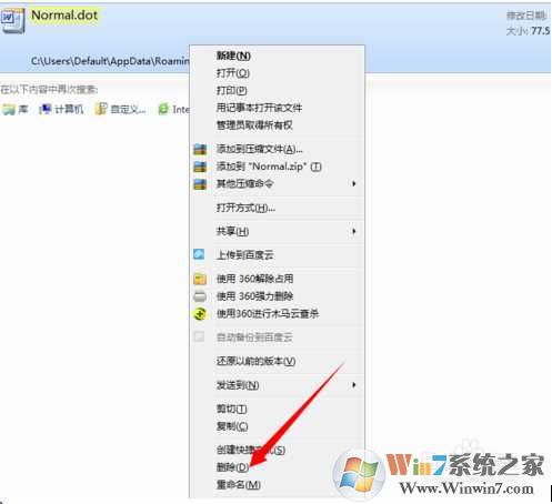 2、在搜索列表中,右鍵點(diǎn)擊Normal.dot將其刪除,再次打開Word由于找不到Normal.dot模板,其會(huì)自動(dòng)創(chuàng)建問題解決cncxm.com Windows7旗艦版下載