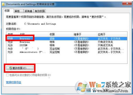 3、在Documents and Settings高級(jí)設(shè)置頁(yè)面的權(quán)限選項(xiàng)卡,選擇拒絕類型后的everyone,點(diǎn)擊下方的更改權(quán)限!