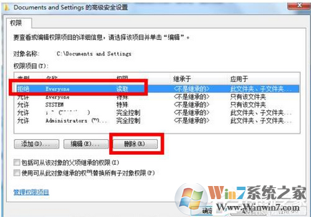 4、在彈出編輯頁(yè)面選中拒絕類型的everyone,點(diǎn)擊下方的刪除按鈕,