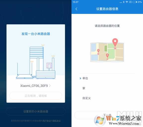 3、點擊設(shè)置新的小米路由器后,系統(tǒng)會自動檢測你的小米路由器然后連接,接著需要設(shè)置路由器位置信息,可以設(shè)置單位、家、自定義三種模式,根據(jù)自己的需求設(shè)置好后進入下一步即可。▼