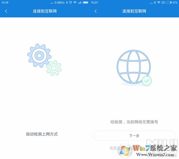 4、然后小米路由器會自動檢測你的上網(wǎng)方式,不需要自己手動選擇那些無線橋接、自動手動撥號的那種,然后檢測成功后點擊下一步就行了,當(dāng)然用戶也可以自行選擇其他上網(wǎng)方式,比起其他路由器繁瑣的設(shè)置,小米路由器真正做到了智能。▼