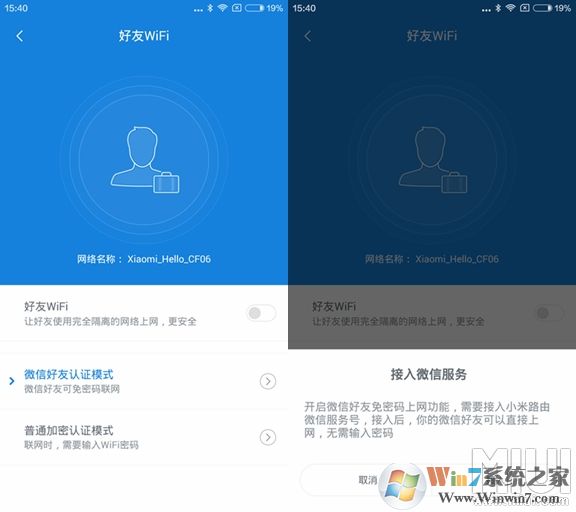 9、升級成功后,在工具箱找到好友wifi選項進行設(shè)置,首次打開默認(rèn)是關(guān)閉狀態(tài),需要手動打開,微信好友認(rèn)證模式里面有兩個選項,分別為:微信好友認(rèn)證模式、普通加密認(rèn)證模式、選擇微信好友模式后系統(tǒng)會彈出接入微信服務(wù)提醒,進入到小米路由器微信公眾賬號界面后,需要小米路由器綁定自己的微信號。(微信需要更新最新版)▼