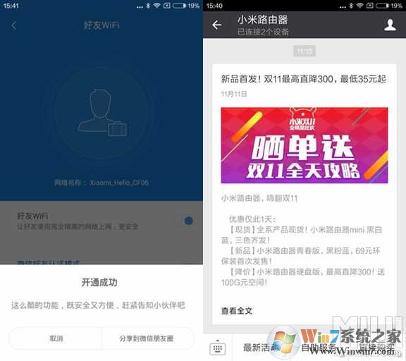 10、綁定微信后系統(tǒng)會提示開通成功,當(dāng)然還可以分享到微信朋友圈,告訴你的微信朋友你家的小米路由器不需要密碼就可以連wifi了,還有進入到小米路由微信公眾號里面也可以查看自己家的小米路由器設(shè)備連接數(shù)量哦。▼