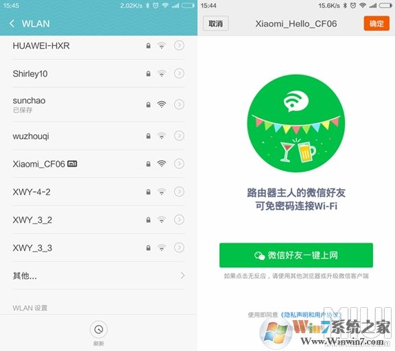 11、接下來只需要拿起朋友的一部手機,打開手機設(shè)置里面的wifi界面,找到自己家里的wifi,小米的路由器帶有“MI”logo圖標(biāo)非常醒目好認(rèn),然后點擊連接,朋友的手機會彈出微信好友一鍵上網(wǎng)的提示,這時自己的手機也會出現(xiàn)微信好友驗證提示,通過驗證后朋友的手機就可以成功連接wifi上網(wǎng)了。▼