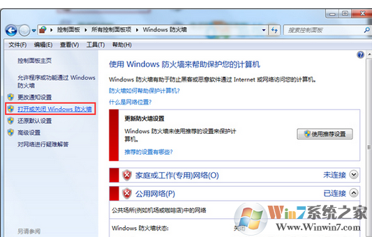 3、在防火墻窗口左側(cè)點(diǎn)擊“打開(kāi)或關(guān)閉Windows 防火墻”