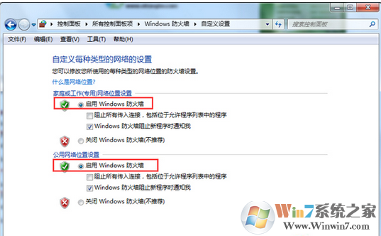 5、在彈出的窗口中將“家庭或工作(專(zhuān)用)網(wǎng)絡(luò)位置設(shè)置”和“公用網(wǎng)絡(luò)位置設(shè)置”下方都選擇為“啟用Windwos 防火墻”即可。