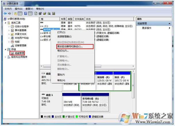 2、打開計(jì)算機(jī)管理頁面后,展開“存儲(chǔ)”選項(xiàng),接著點(diǎn)擊“磁盤管理”,可以在中間窗格中看到驅(qū)動(dòng)器列表。鼠標(biāo)右鍵點(diǎn)擊u盤,接著選擇菜單中的“更改驅(qū)動(dòng)器號(hào)和路徑”,如下圖所示: