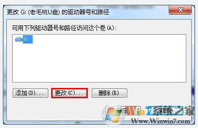 3、在隨后彈出的更改驅(qū)動(dòng)器號(hào)和路徑窗口中,我們點(diǎn)擊u盤盤符,然后點(diǎn)擊“更改”按鈕,如下圖所示: