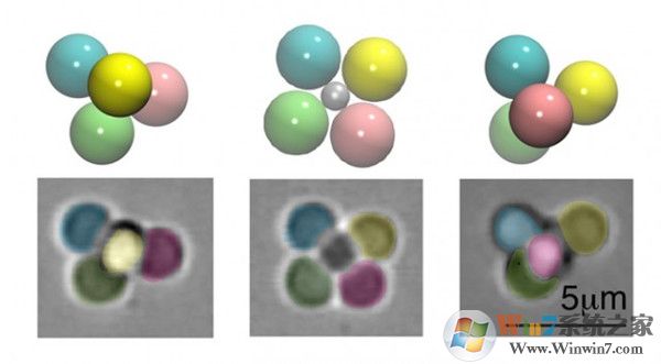 這個(gè)系統(tǒng)利用與中心球體相連的納米顆粒進(jìn)行數(shù)據(jù)存儲(chǔ)。當(dāng)中心球體較小時(shí),外圍顆粒能夠穩(wěn)定的排列,存儲(chǔ)數(shù)據(jù);當(dāng)中心球體變大時(shí),顆粒就可以重新排列,存儲(chǔ)不同的信息。研究團(tuán)隊(duì)利用聚合物材料制造了一個(gè)包含1個(gè)中心球體和4個(gè)納米顆粒的集群。當(dāng)液體被加熱時(shí),中心球體膨脹,顆粒隨之進(jìn)行可預(yù)測(cè)的重排。雖然4個(gè)納米顆粒只有兩種不同的組合方式(和比特一樣),但研究者們計(jì)劃用更多的顆粒來(lái)制造存儲(chǔ)團(tuán)。