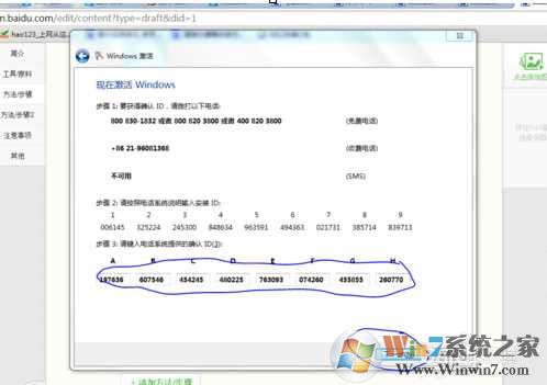 6、接下來就是需要你撥打電話,建議你撥打免費(fèi)電話,手機(jī)撥打800開頭的,座機(jī)撥打400開頭的。通話過程中按照提示進(jìn)行操作,語言1產(chǎn)品2,接著輸入安裝ID(就是剛剛的Windows激活窗口中的第二條信息,共54位),輸完54位數(shù)字后,也許會(huì)問你是不是在同一臺(tái)機(jī)器上重新安裝系統(tǒng),請(qǐng)選是,即1, 是不是已經(jīng)卸載了前一個(gè)安裝,請(qǐng)選是,即1。注意:若不按照上面提醒操作,就不會(huì)得到48位數(shù)字,并且會(huì)轉(zhuǎn)接到人工服務(wù)(人工服務(wù)你是不可能激活的了的,難道你說我是網(wǎng)上找的密鑰嗎?),這樣你激活就會(huì)出現(xiàn)困難了! 等待為你回應(yīng)提供48位激活碼,記錄下來后,在激活窗口中輸入,點(diǎn)擊下一步,您的windows 7即可激活成功。 得到48位激活碼。winwin7.com