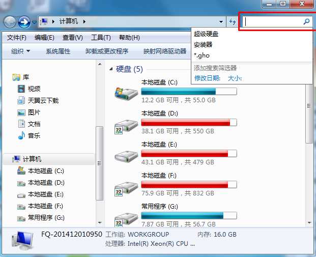 打開桌面上的“計算機”,然后可在搜索框中搜索,注意在此搜索代表只搜索計算機中的文件;