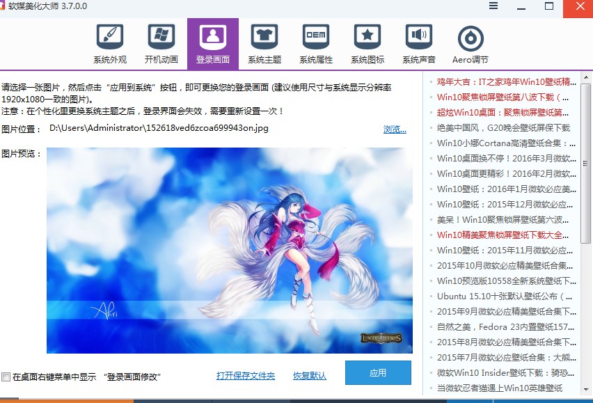 第三部、點(diǎn)擊上方的登錄畫面,然后點(diǎn)圖片位置后面的瀏覽、找到自己準(zhǔn)備好的圖片,點(diǎn)擊應(yīng)用即可