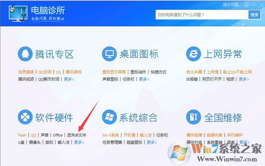 3、進入“電腦診所”界面,在軟件硬件界面點擊“丟失dll文件”;