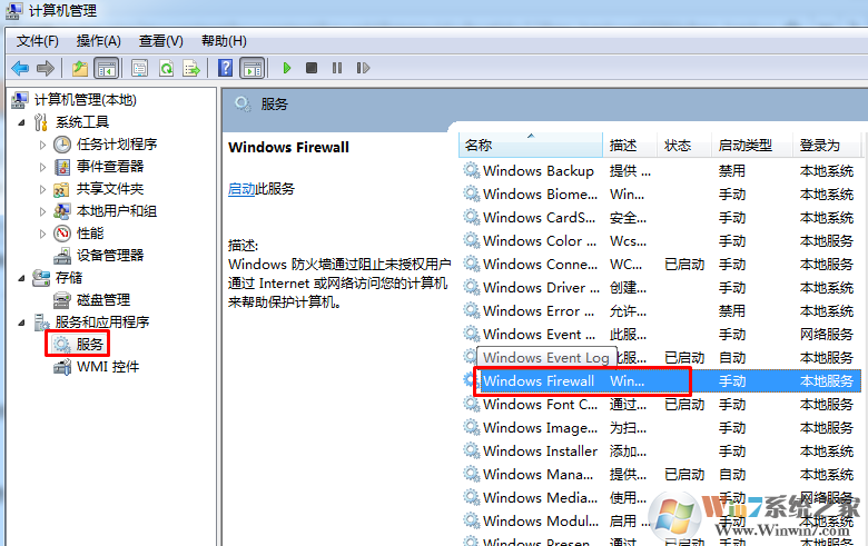 2、打開了“計算機管理”窗口,點擊左側(cè)的“服務(wù)”選項面板,右邊找到“Windows firewall”,可以發(fā)現(xiàn)此服務(wù)目前處理禁用狀態(tài);