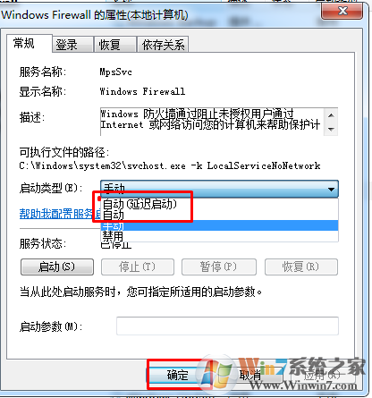 3、鼠標(biāo)左鍵雙擊此服務(wù),彈出“Windows firewall”屬性窗口,按照圖示順序設(shè)置,最后點擊“確定”按鈕退出設(shè)置;