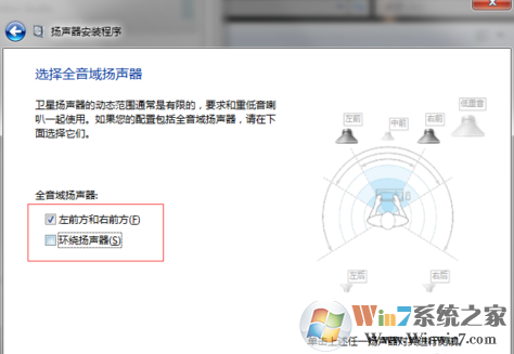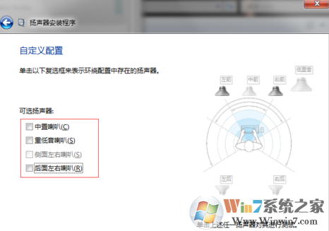 5、在新界面左側(cè),取消勾選“環(huán)繞揚聲器”(同樣因為 2.1聲道并無此設備),進入下一步;